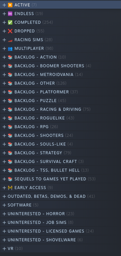 I’m surprised I didn’t see it mentioned here (unless I missed it) but I use the “hide game” function liberally. Anything I’m not interested in, gave up on with no chance of trying again, completed with no desire to revisit, or won’t touch for any other reason just goes away, out of sight. It helps give a real sense of progression through your collection and you can pare it down to favorites you would likely revisit and things you have yet to play. And the hidden tab is easily viewable if you ever want to look at everything for any reason like rethinking putting a particular game in there.
