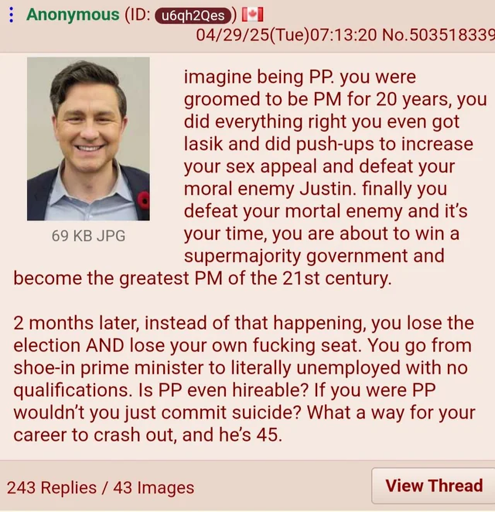 This guy secured a government pension by the time most people are still trying to get their footing financially. He’s also never created anything of value as a career politician. At the very least Justin Trudeau was a drama teacher and snowboard instructor. Carney has had multiple ‘grown up’ jobs. I wouldn’t feel bad for PP.