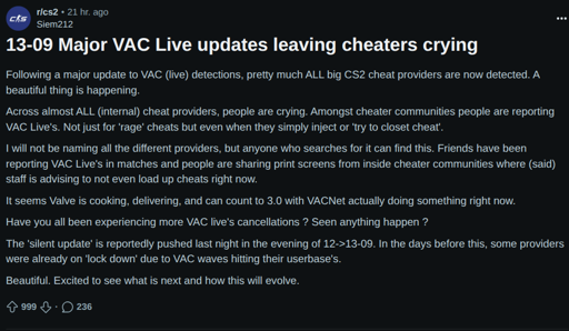 I really hope valve can get VAC into a good space so it can be an example of doing anti-cheat well without having to be a rootkit. Looks like we’re heading towards thst point. Hopefully this change will last