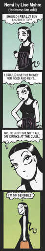 - Panel 3 about “loads of drugs” is a little odd too. First of all, it makes it sound like “drugs” is cheap, which… if she’s huffing inhalants, maybe. Which brings up the point that “drugs” covers an awful lot of territory. If she’s really doing the hard stuff she’d just steal the top and sell it, but I don’t think that’s the mood here. The mood is more like “at least I’m not doing something that’s worse than buying this top.” In other strips she’s shown as going to nightclubs and buying drinks, and club drinks are always overpriced, so I figured that’s a decent substitute.