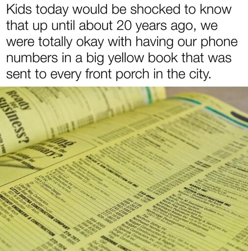 The yellow pages only had businesses. It was the big white book that had all the people’s numbers in it. It also had addresses O.o