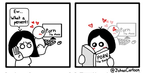 When a woman wants to read a fictional story with relatable characters and emotional context who are also attracted to each other and have sex in about 30% of the scenes it’s seen as a bit of naughty fun, but when a man wants to jerk off for 3 minutes to a close-up clip of an over-saturated oil-coated faceless asshole getting pounded by a faceless cock, and maybe go for a bonus scene of the girl turning red and gagging from being facefucked, suddenly he’s a “pervert”