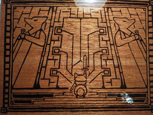 Hand done wood burning on mahogany. It’s an image from the game manual of Tunic (if you haven’t played, the manual is unlocked by finding its pages during gameplay). After cleaning up the enlarged image a little bit I transferred the image by hand with carbon paper before sitting down to do the burning in of the image.
